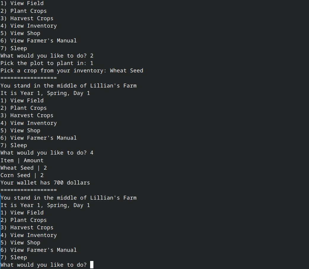 PyFarm is a console-based text game about tending a farm. PyFarm includes crop planting, harvesting, and selling; animal tending and products; farm and barn upgrades; random events; and a JSON-based save system!